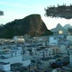 An UFO fleet hovering above buildings in a Rio de Janeiro neighborhood, with drones flying around. Can be used in science fiction interstellar travel or in war-game backgrounds.