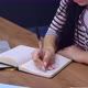 close up woman sitting at the desk writing in notebook timetable modern office. on the table laptop