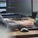 Unrecognizable programmer developer, writes code. Modern workplace with powerful PCs and monitors. coding