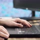 Unrecognizable programmer developer, writes code. Modern workplace with powerful PCs and monitors. coding