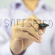 Young Man, Businessman, entrepreneur, creative designer, freelancer writes and draws on transparent wall : Unsatisfied