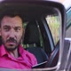Upset businessman is reflected in the rearview mirror of the car says. A young man driving against the backdrop of green trees, a hot sunny summer day. Warm soft light, close-up. 4K UHD.