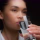 Upwards. Asian business woman in office clothes holds a transparent glass of water, drinks mineral water, quenches thirst, isolated on a black background