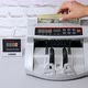 US Dollar bills. Woman putting money into counting machine at table indoors, close up.