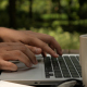 Man using computer laptop on wooden desk in the garden. Full HD 25 fps 0:12 Sec.