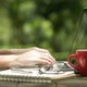 Freelancer using on computer with old wooden desk in the garden. Full HD 25 fps 0:15 Sec