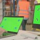 Warehouse Inventory Manager Works on a Green Mock-up Screen Computer while Sitting at His Desk. In the Background Shelves Full of Packages Ready For Shipping.