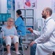 Doctor is using augmented reality to better understand disabled patient problem while the senior woman sitts in wheelchair in rehabilitation clinic. Medicine of the future, futuristic health care