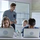 Group of four primary school students typing something on laptop computers when doing task during information technology lesson