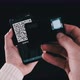 Young man uses portable cold crypto wallet to scan QR code on a smartphone for a transaction. Using modern device camera for sending Bitcoin on black background. Digital cash, safe, future concept. 4K