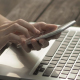 Woman using a smartphone and typing computer at wooden desk. Full HD 25 fps 0:12 Sec.