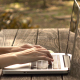 Freelancer typing text message on smartphone and typing computer in park. Full HD 25 fps 0:13 Sec..
