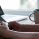 Using smartphone on wooden desk
