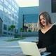 Using technology outdoors. Young woman working. Businesswoman with laptop computer. Lady works on her notebook stylish urban background. Happy and reacts positively to what sees screen