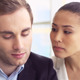 Office workers using digital tablet at meeting
