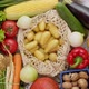 Vegetables in reusable net bags on white scratched background, top view. Zero waste and eco friendly concept