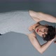 Vertical. Transgender guy with makeup posing on grey background. Medium shot. Masculine and feminine characteristics in one person. Gender identity concept 4k