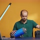 Videographer recording tutorial about new cinema light in studio. Professional studio video and photo equipment technology for work, photo studio social media star and influencer