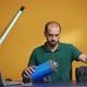 Videographer recording tutorial about new cinema light in studio. Professional studio video and photo equipment technology for work, photo studio social media star and influencer