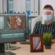 Videographers with protection masks working at video project creating content, team of bloggers sitting in new normal office studio. Freelancers editing video durig global pandemic