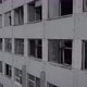 Aerial view of an empty multi-storey building. Broken frames and window panes, general desolation.