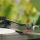 Vinyl disk close-up. Vintage old vinil black disc spinning. Retro music record player.