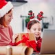 Virtual communication on holidays. Happy proud mother on Santa hat embracing her cute little daughter, video chatting with friends online at home, slow motion