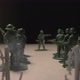Toy soldiers in uniform in smoke. War concept. Toy soldiers in the ranks.