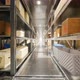 The camera flies through a huge industrial warehouse with boxes. A large logistics terminal. Looped realistic 3D animation.