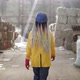 Waste processing plant. Recycling and storage of waste for further disposal. Woman worker in hard hat walking through the stacks of pressed disposal waste, huge piles. Rare view.