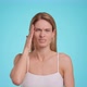 Weather dependance concept. Attractive middle aged woman suffering from migraine attack, touching her painful head and frowning, blue studio background, slow motion