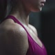 Young woman with wet skin doing exercise with dumbbells in the dark gym