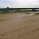 An aerial shot of a late-summer wheat harvest at sunset.