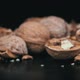 Whole walnut rolls in slow motion against a background of pile of nuts in a loop. A lot of walnuts in the shell rotate on a black background. Nuts are good for the brain. Heap of walnuts close-up.