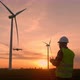 Young windmill engineer, worker flying drone on site in wind turbine field or farm, clean energy source. Eco-technology for electricians. industry nature environment. People