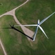 In the shot you can see white wind energy generator (mill) with three blades in slow rotation. Windmill is working in sunny day so you can see shadow also rotating on the green grass covered ground surface.