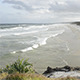 Beach on a windy day with plants swaying in the wind and people walking on the sand with an overcast sky