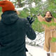 Carefree couple enjoying their snowball fight in the woods