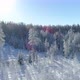 Flying and rising between trees and white snow covered branches in cold sunny winter day aerial drone shot.