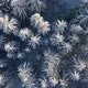 Top bird view of snowy winter forest with frozen trees in cold sunny day. Aerial view.