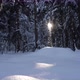 Winter forest. View of the trunks of coniferous trees and branches. Covered with a layer of snow, through which the sun is visible. Large snowdrifts. The beauty of nature.