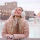 Wintertime. Christmas holiday, woman standing outside lean on fence ice rink smile and invite friends hand gesture. Christmas illumination decoration background. Winter holiday season. Blurred people.