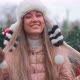 Wintertime. Christmas holiday, Young adult woman enjoys snowy winter outside. Portrait of caucasian beautiful female in funny fur hat. Having fun, pulling hat on his eyes, laughing. Handheld