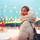 Wintertime. Christmas holiday evening, woman standing outside looking ice rink than look back and smile. Christmas illumination and decoration background. Winter holiday season. Christmas market Happy