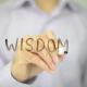 Man, Businessman, entrepreneur, stock trader, analyst or banker writes on transparent wall : Wisdom