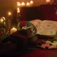 Witch cooking potion elixir close-up. Table with spellbook for making rite. Herbs, burning candles, crystal magic ball for sacrifice. Halloween theme, full moon, witchcraft.
