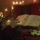 Witch cooking potion elixir close-up. Table with spellbook for making rite. Herbs, burning candles, crystal magic ball for sacrifice. Halloween theme, full moon, witchcraft.