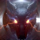 A raged wolf with glowing eyes on a foggy background