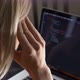 Woman developer coding on laptop computer with headache. Close-up view face by side