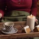 Woman drinking a coffee in a bed. Tray with cookies and candle